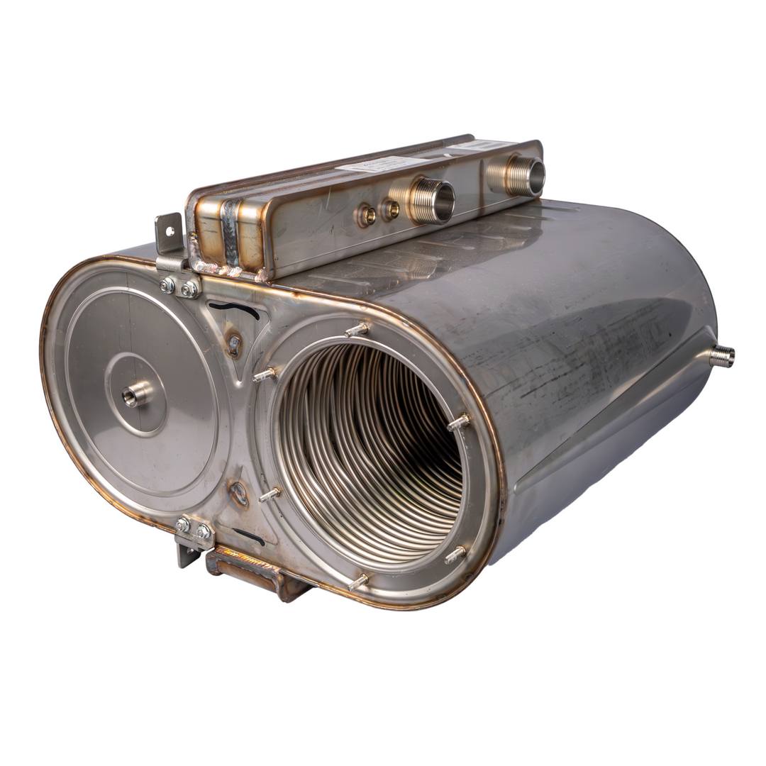 Передает тепловую энергию сжигаемой в камере сгорания газовоздушной смеси теплоносителю посредством теплопроводности. Альтернативное название - монотермический теплообменник.